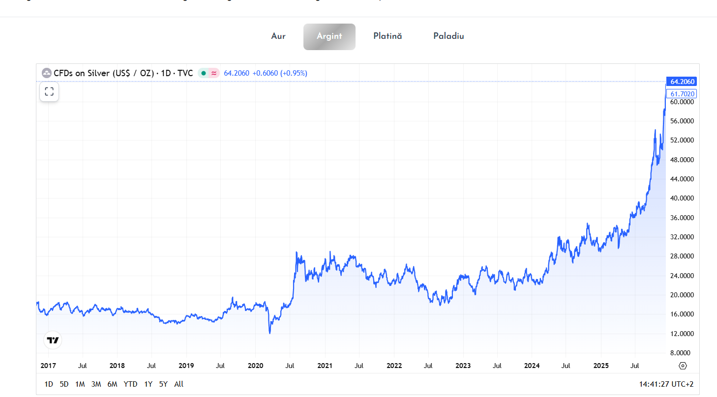 Prețul actual echivalează cu circa 1,93 $/gram (aproximativ 8-9 lei/gram pentru argint pur de 999,9‰). Această creștere fulminantă (peste 100% în 2025) a fost susținută atât de factori speculativi – precum așteptările privind scăderea dobânzilor FED– cât și de o criză a ofertei pe piața fizică în octombrie 2025. Argintul a avut astfel o evoluție mult mai dinamică decât aurul, care „s-a mulțumit” cu +60% în același interval.