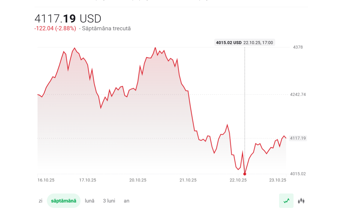 Aurul a înregistrat marți, 22 octombrie 2025, cea mai mare scădere zilnică din ultimii 12 ani — peste 6% într-o singură zi, până la 4.082 $/uncie.