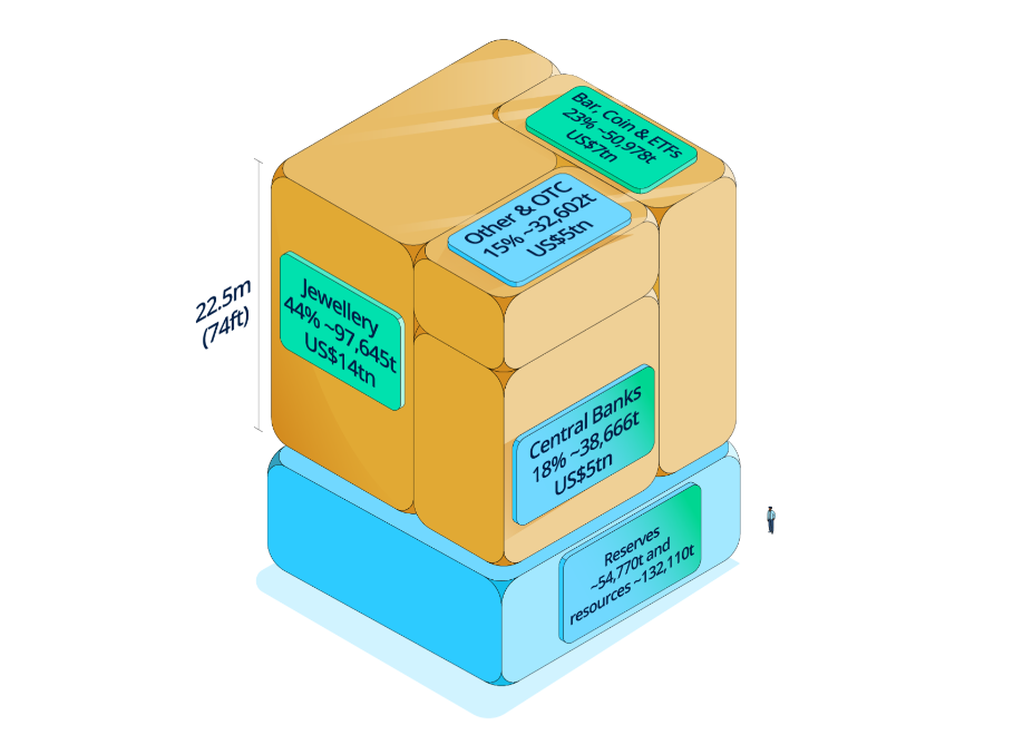 Aceasta înseamnă că întreaga avere de aur a lumii ar putea sta confortabil sub Arcul de Triumf sau într-un bloc cu 7 etaje.