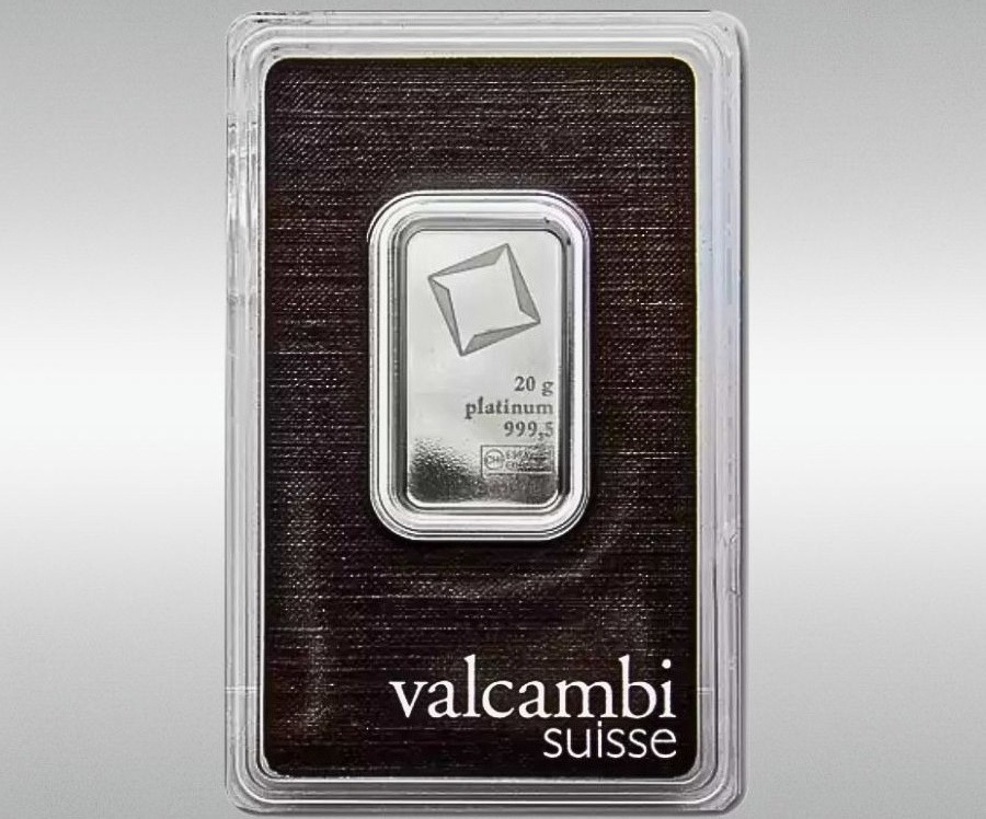Exemplu de lingou de platină Valcambi (20 grame, puritate 99,95%). Aceste lingouri vin sigilate în ambalaje etanșe care includ seria, greutatea și puritatea metalului.
