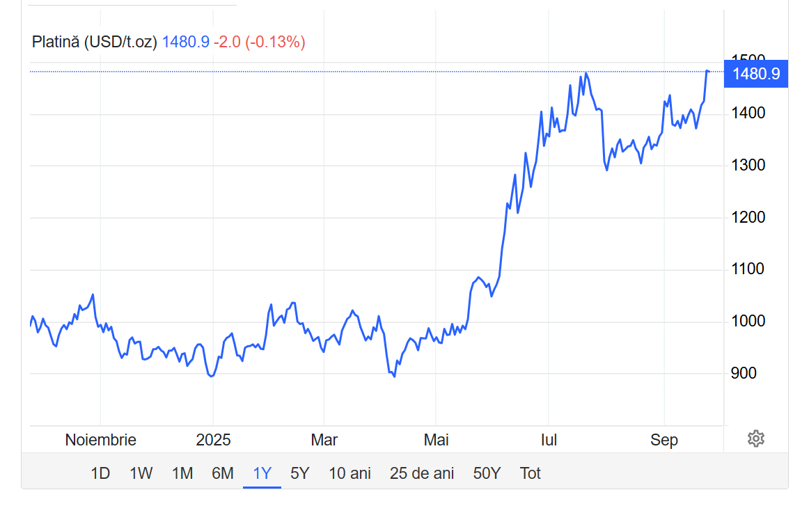 Acest dezechilibru „structural” între cerere și ofertă a dus la creșterea accelarată a prețului în 2025 (+60% YTD până în vară. În plus, pe fondul conflictelor și tensiunilor (ex. tarife comerciale recente, redistribuirea comenzilor către aliați etc.), investitorii și consumatorii percep platina ca un activ de refugiu.