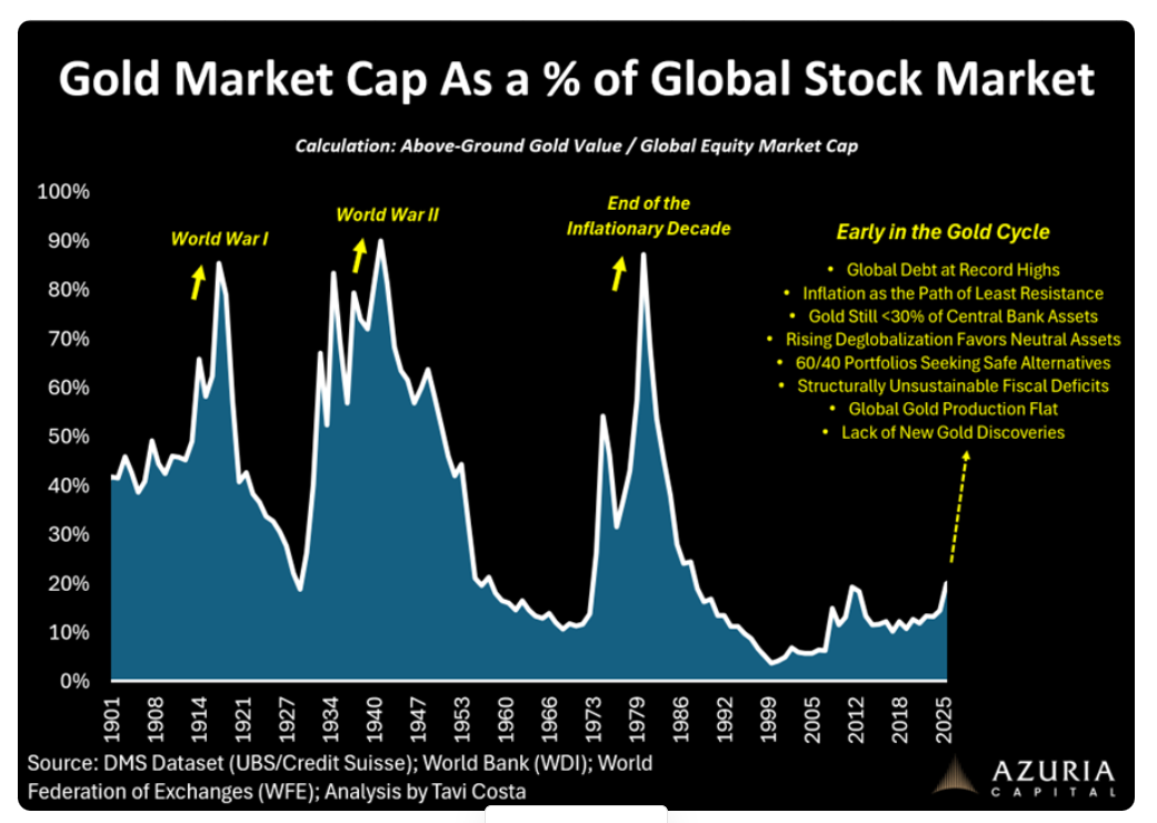 În 2026, indicatorii sugerează că suntem abia la jumătatea drumului în ceea ce privește mișcarea ciclică actuală, dar într-un stadiu incipient al trendului secular, deoarece alocările investitorilor în aur rămân istoric scăzute.