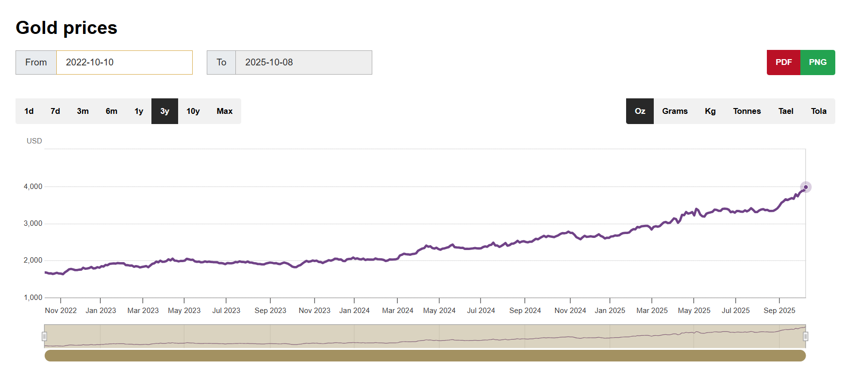 Pe 7 octombrie 2025, contractele futures cu scadenţă în decembrie au urcat la un maxim de 4.014,6 $ și au închis la 4.004,4 $, marcând o etapă istorică. Diferenţa dintre preţul spot şi cel futures reflectă aşteptările pieţei privind livrările viitoare, ratele dobânzilor şi costurile de depozitare.