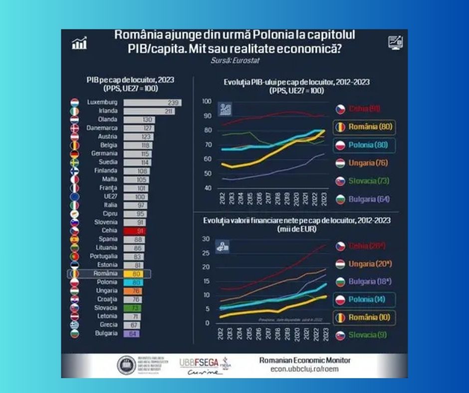 Polonia – ~77% din media UE (~39.000 $ PPP); economia poloneză e mai mare în ansamblu, dar pe locuitor e puțin sub România acum.