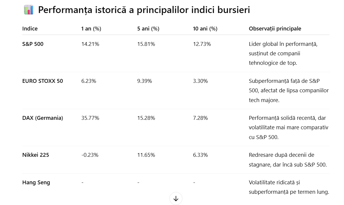 S&P 500: A oferit cele mai bune randamente pe termen lung, susținut de companii tehnologice precum Apple, Microsoft și Amazon.
