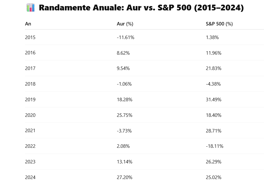 Pentru investitori, o strategie echilibrată care să includă atât aur (pentru protecție), cât și S&P 500 (pentru creștere pe termen lung) poate oferi diversificare și stabilitate portofoliului.